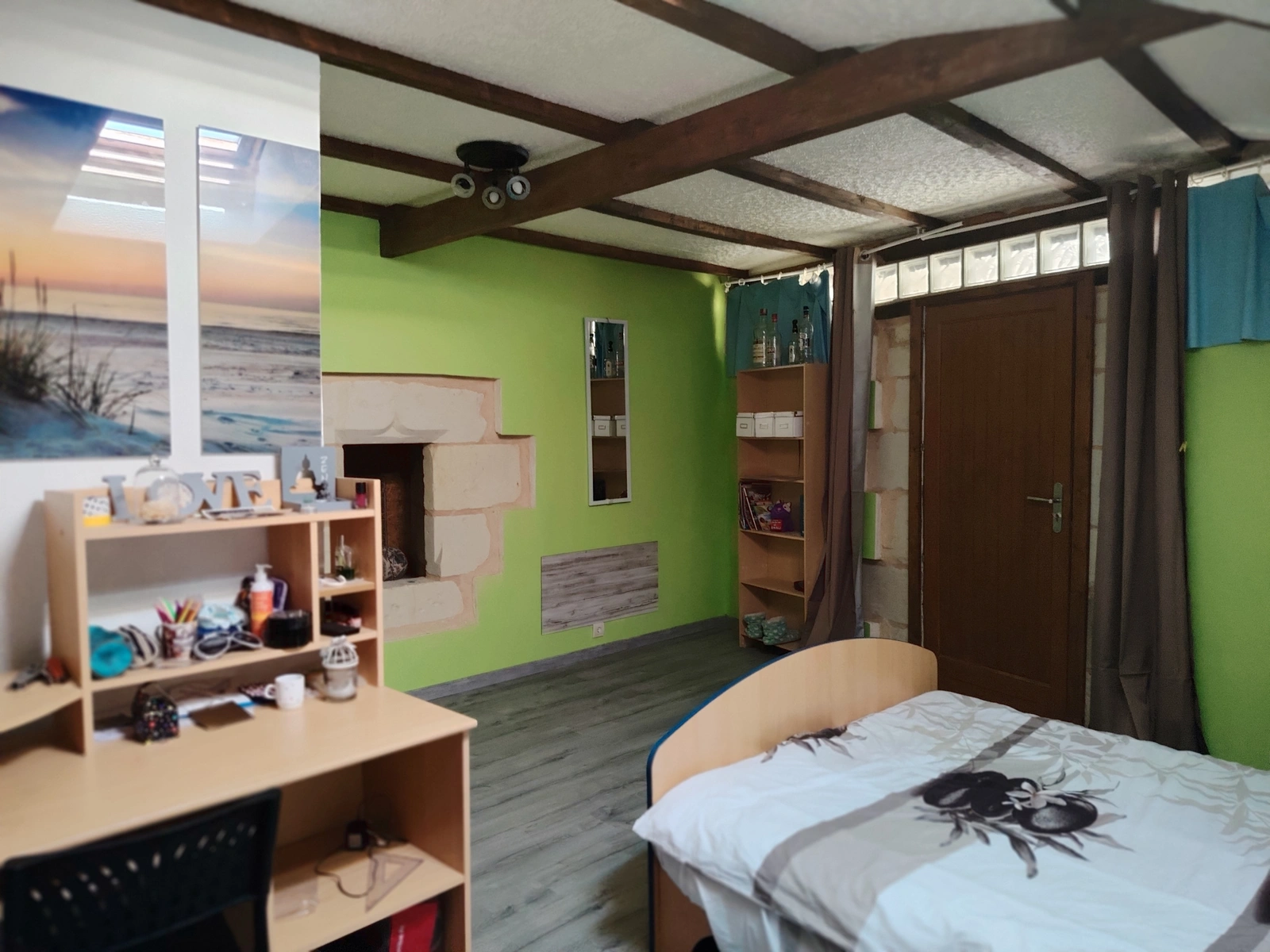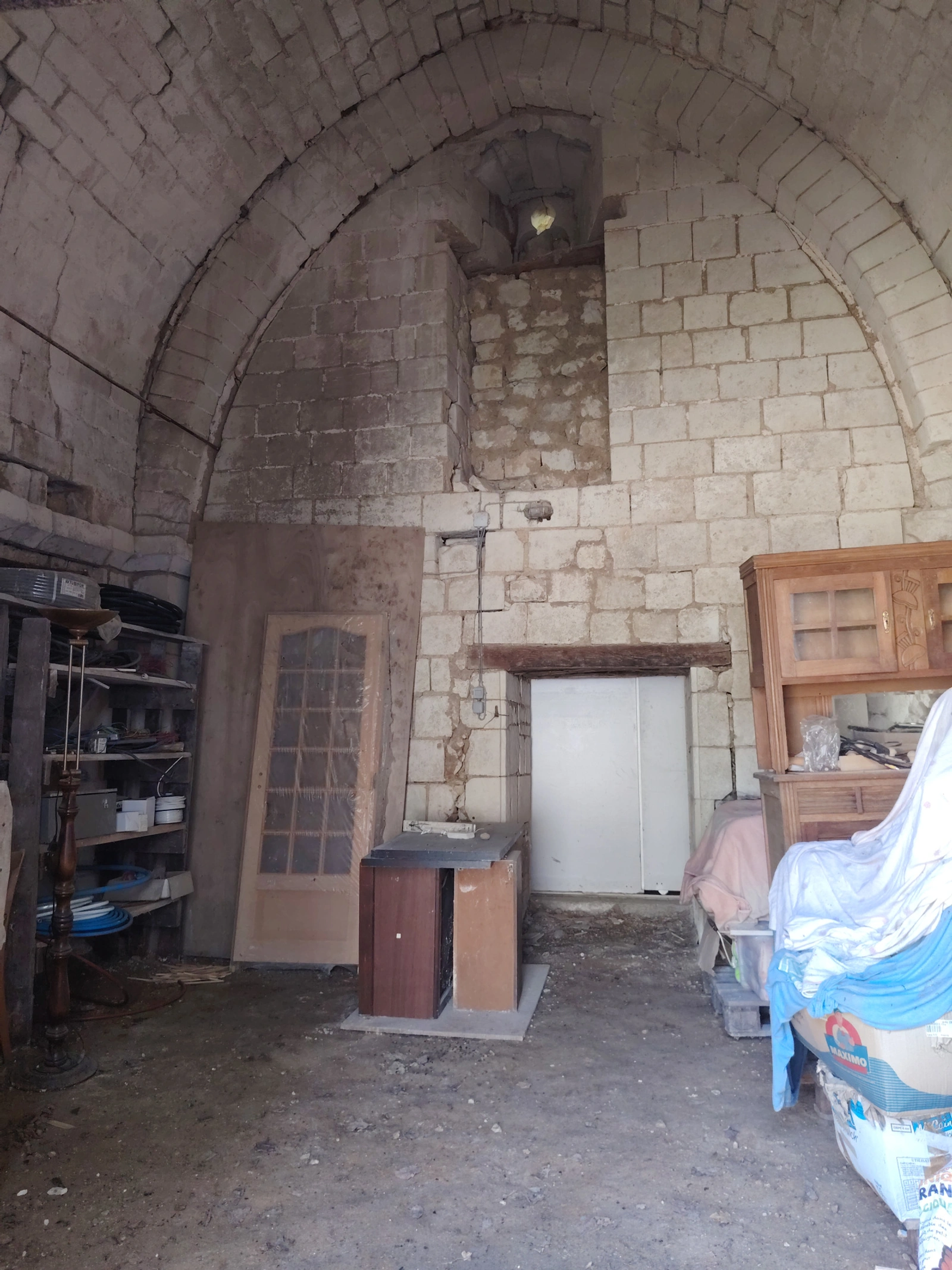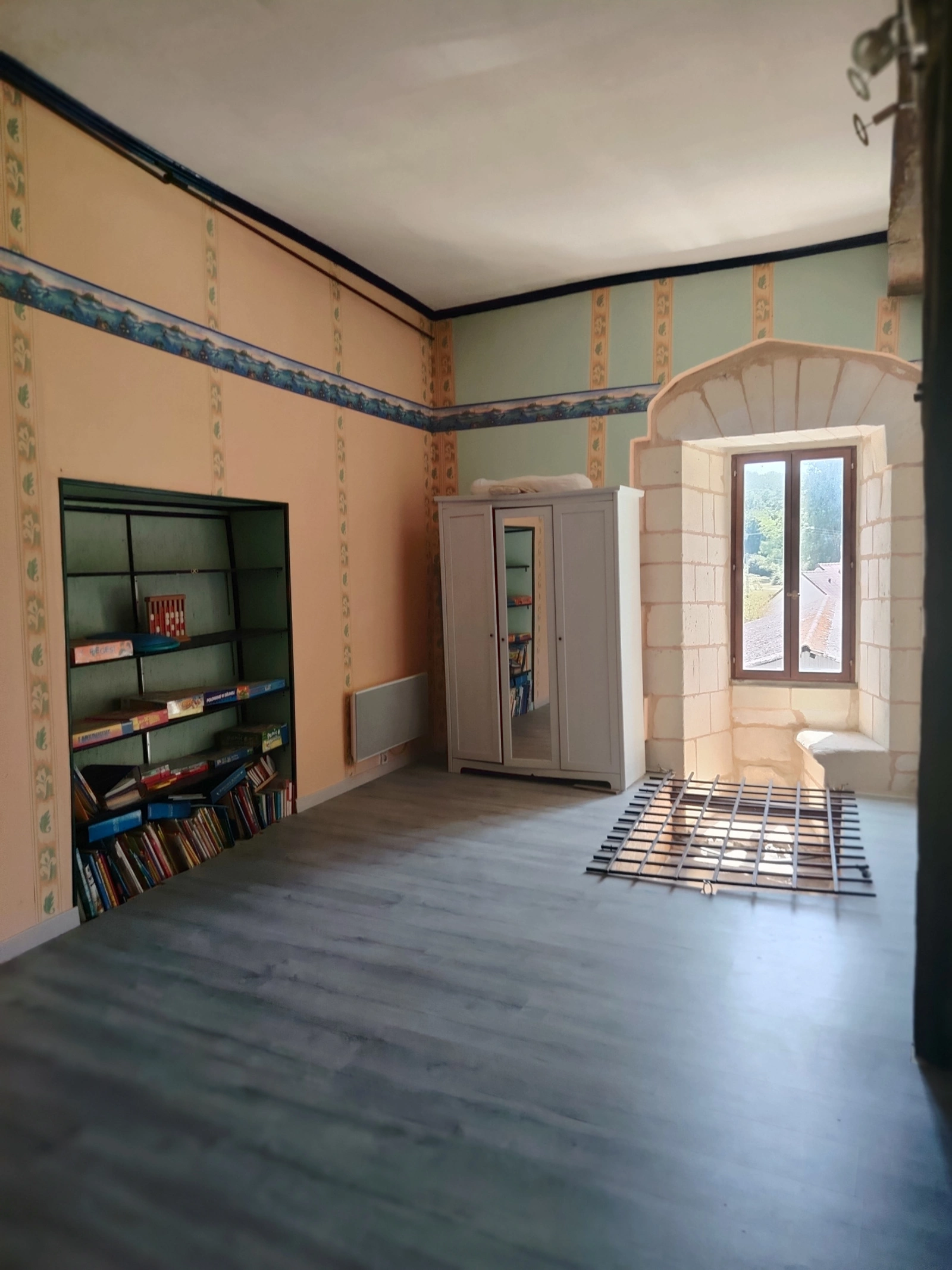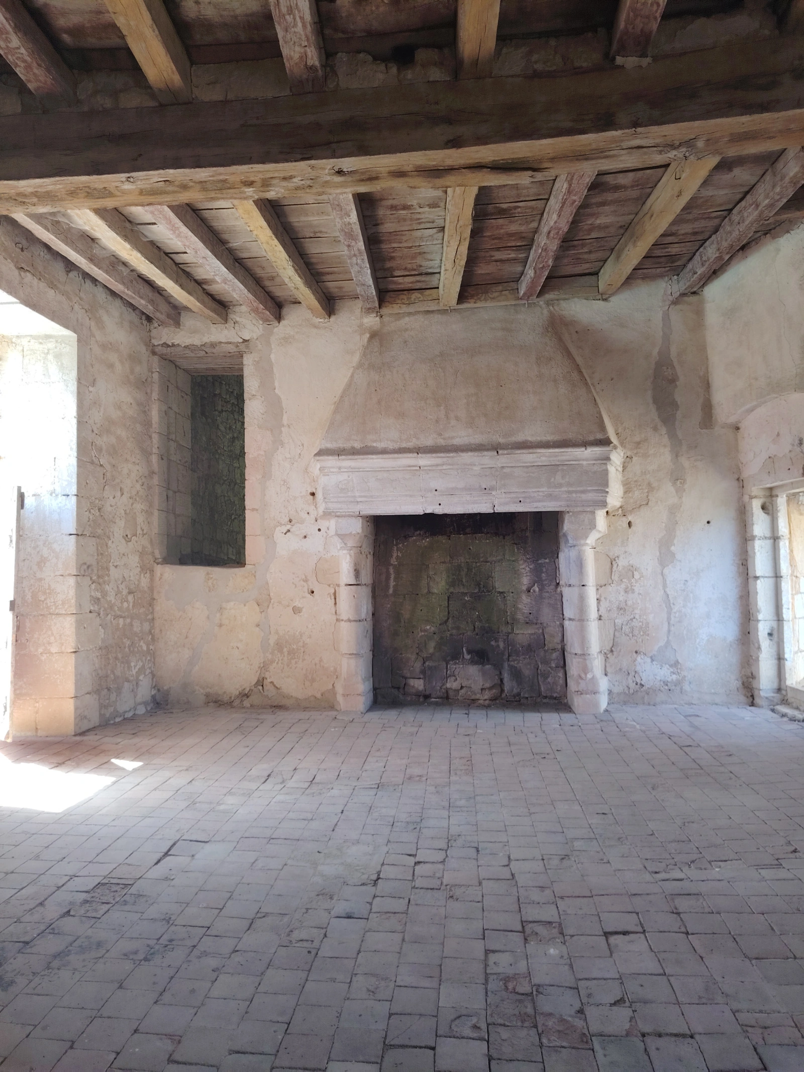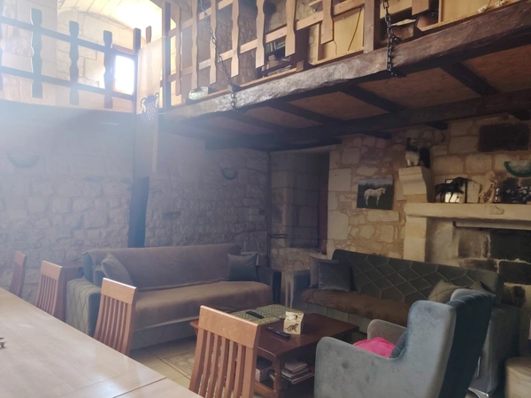 - Espaces authentiques à restaurer, dont une salle avec grande cheminée ancienne et poutres ornées de peintures médiévales.